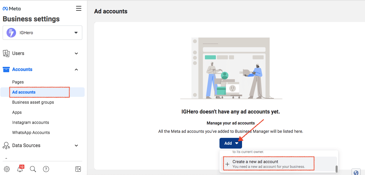 進入Business Setting的頁面後,點擊「Ad Accounts」廣告賬號。你可以立即「Add」》「Create a new ad account」創建新的廣告賬號。
